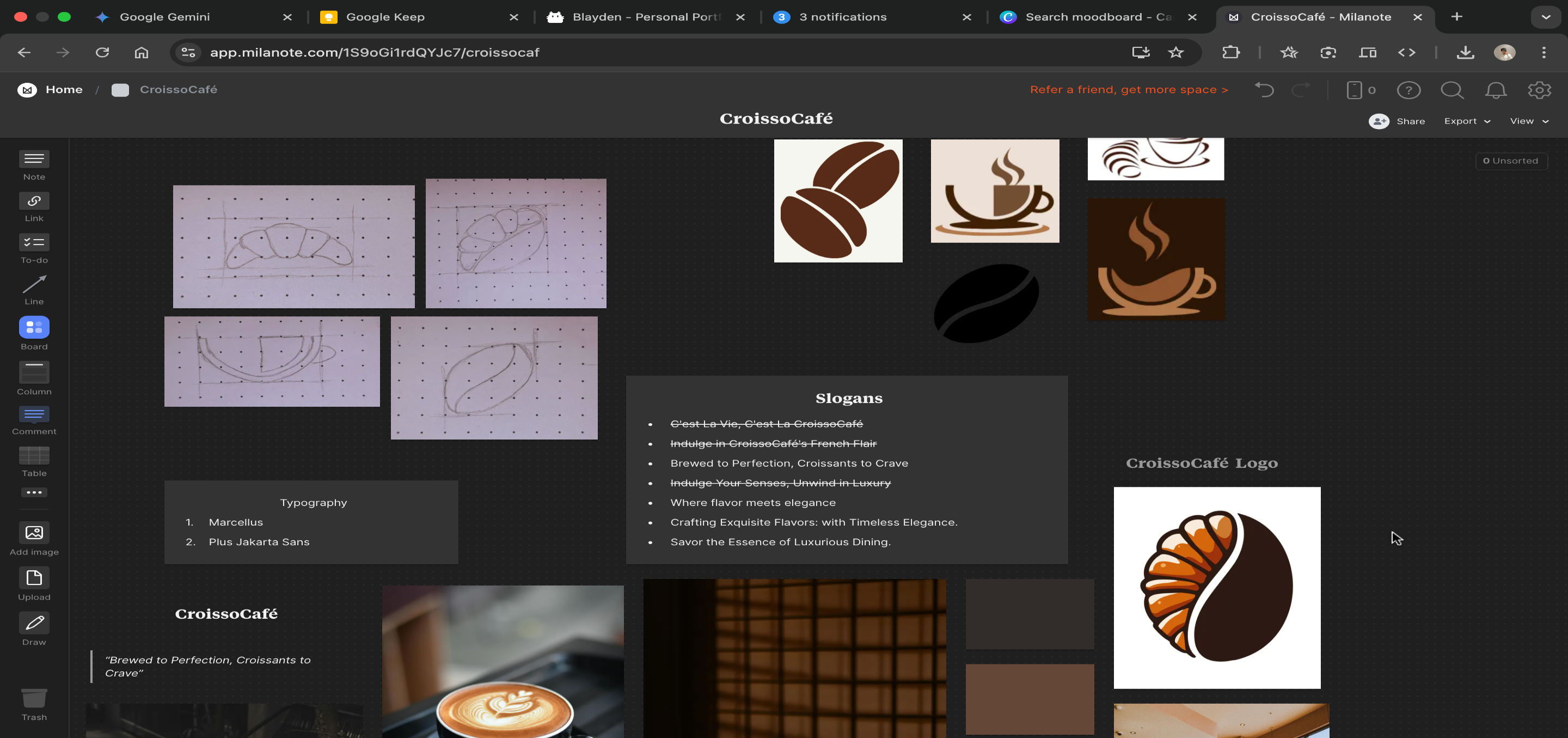 CroissoCafe is a self-initiated branding project focused on crafting a modern, elegant café identity. The project involved end-to-end design — from brainstorming and moodboarding in Milanote, to logo sketching, mockups, and building a responsive landing page UI using HTML5, CSS3, and JS. It's a demonstration of my design sensibility, frontend development, and creative direction.